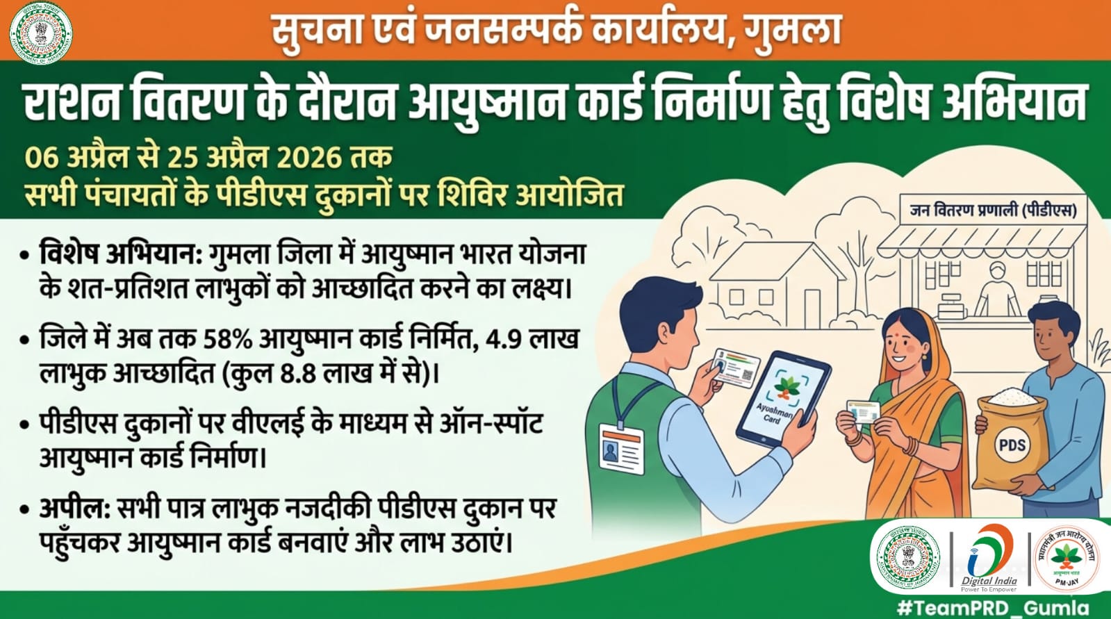 जागता झारखंड संवाददाता बसंत कुमार गुप्ता गुमला : गुमला उपायुक्त प्रेरणा दीक्षित के निर्देशानुसार गुमला जिला में आयुष्मान भारत योजना के तहत शत-प्रतिशत पात्र लाभुकों को आच्छादित करने के उद्देश्य से विशेष अभियान चलाया जाएगा। वर्तमान में जिले में कुल राशन कार्डधारियों का 58 प्रतिशत ही आयुष्मान कार्ड बन पाया है। कुल 8.8 लाख राशनकार्ड लाभुकों में से लगभग 4.9 लाख लाभुकों को ही अब तक योजना से आच्छादित किया जा सका है, जबकि सभी पात्र लाभुकों को योजना से जोड़ना लक्ष्य निर्धारित किया गया है । इसी क्रम में जिले के सभी प्रखण्डों के सभी पंचायतों में राशन वितरण के समय व्यापक स्तर पर आयुष्मान कार्ड निर्माण हेतु शिविर आयोजित किए जाएंगे । यह शिविर दिनांक 06 अप्रैल 2026 से 25 अप्रैल 2026 तक सभी जन वितरण प्रणाली (पीडीएस) दुकानों पर संचालित होंगे। इन शिविरों में वीएलई के माध्यम से लाभुकों का ऑन-स्पॉट आयुष्मान कार्ड बनाया जाएगा ताकि अधिकाधिक लोगों को योजना का लाभ मिल सके।अभियान के सफल संचालन हेतु प्रखण्ड स्तर पर सभी प्रखण्ड विकास पदाधिकारी तथा पंचायत स्तर पर सभी पंचायत सचिव को नोडल पदाधिकारी नामित किया गया है। जिला स्तर पर निगरानी एवं अनुश्रवण के लिए सिविल सर्जन, जिला आपूर्ति पदाधिकारी, जिला समाज कल्याण पदाधिकारी तथा जिला कार्यक्रम प्रबंधन इकाई, एनएचएम, गुमला को जिम्मेदारी सौंपी गई है। सम्पूर्ण कार्यक्रम के प्रभावी क्रियान्वयन एवं अनुश्रवण हेतु उप विकास आयुक्त, गुमला को वरीय पदाधिकारी नामित किया गया है। सभी वीएलई को सक्रिय पीडीएस डीलरों के साथ टैग किया गया है ताकि राशन वितरण के दौरान आपसी समन्वय स्थापित करते हुए अधिक-से-अधिक पात्र लाभुकों का आयुष्मान कार्ड निर्माण सुनिश्चित किया जा सके । सभी पात्र लाभुकों से अपील है कि वे अपने नजदीकी पीडीएस दुकान पर निर्धारित तिथि के अनुसार पहुंचकर आयुष्मान कार्ड बनवाएं और योजना का लाभ अवश्य उठाएं।